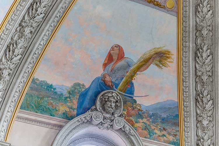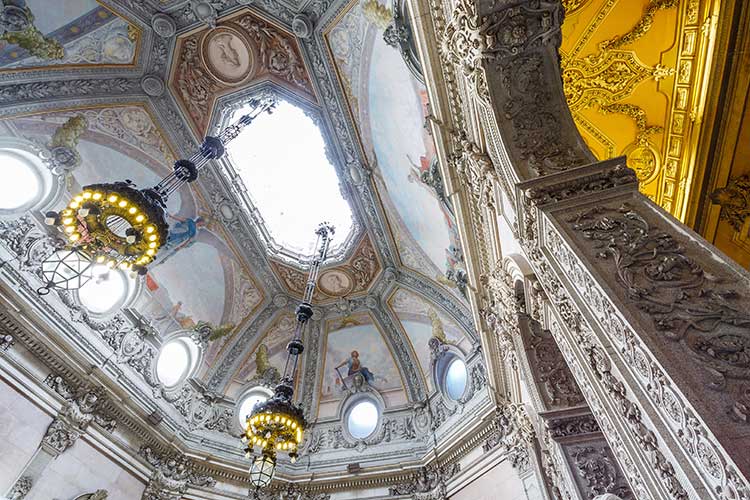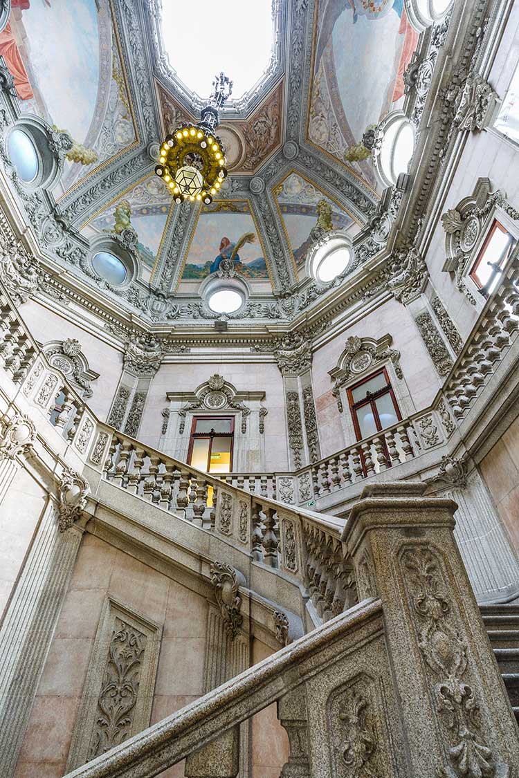 Tratamento das superfícies estucadas e pintadas da Sala Medina e Escadaria Nobre.