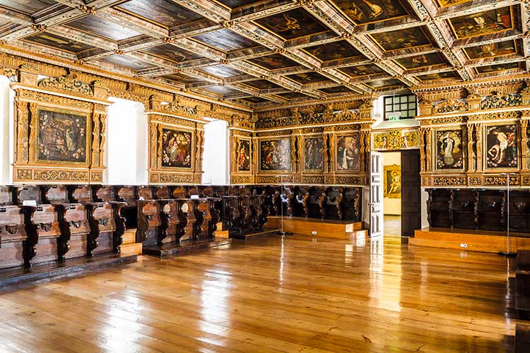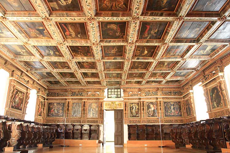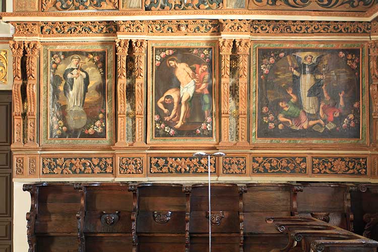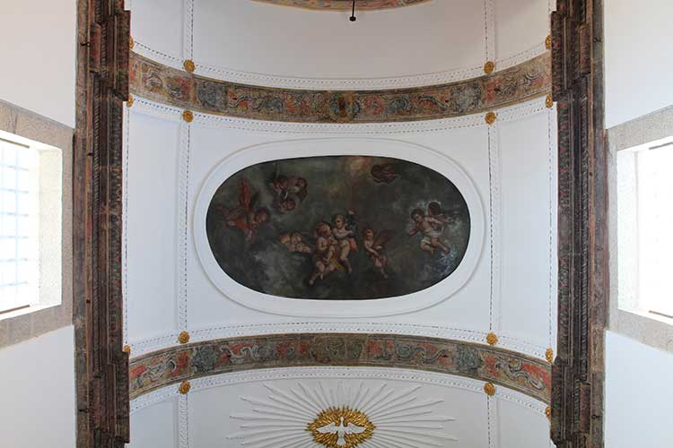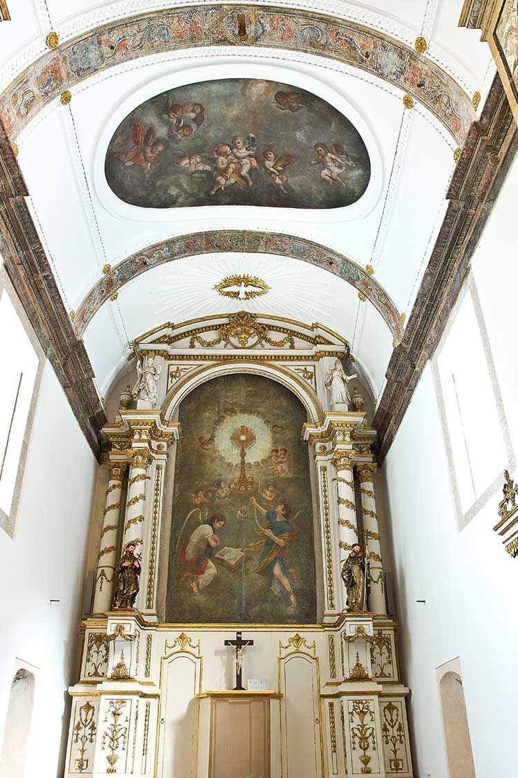 Arte sacra: Tetos e altares em talha dourada, escultura. Pintura sobre tábua. Pintura mural.
