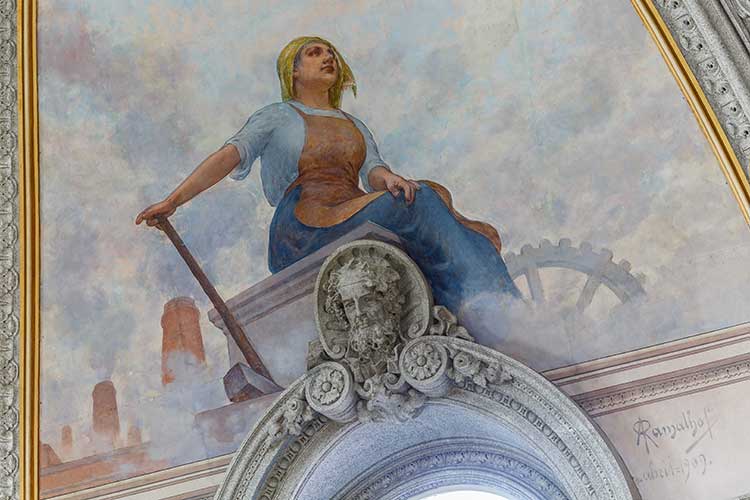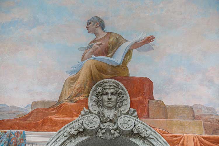 Tratamento das superfícies estucadas e pintadas da Sala Medina e Escadaria Nobre.